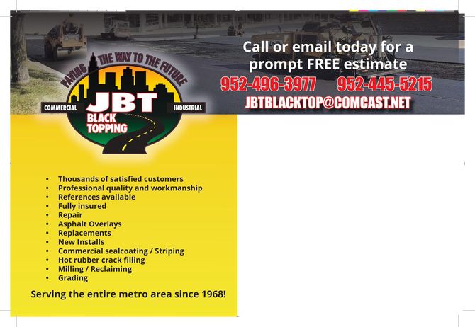 At JBT Blacktopping, we take pride in providing exceptional asphalt paving and repair services to our customers. We would be grateful if you could share your thoughts about our business with others. Your feedback helps us improve and helps others make informed decisions. Please take a moment to leave a review of JBT Blacktopping and let others know what you think.